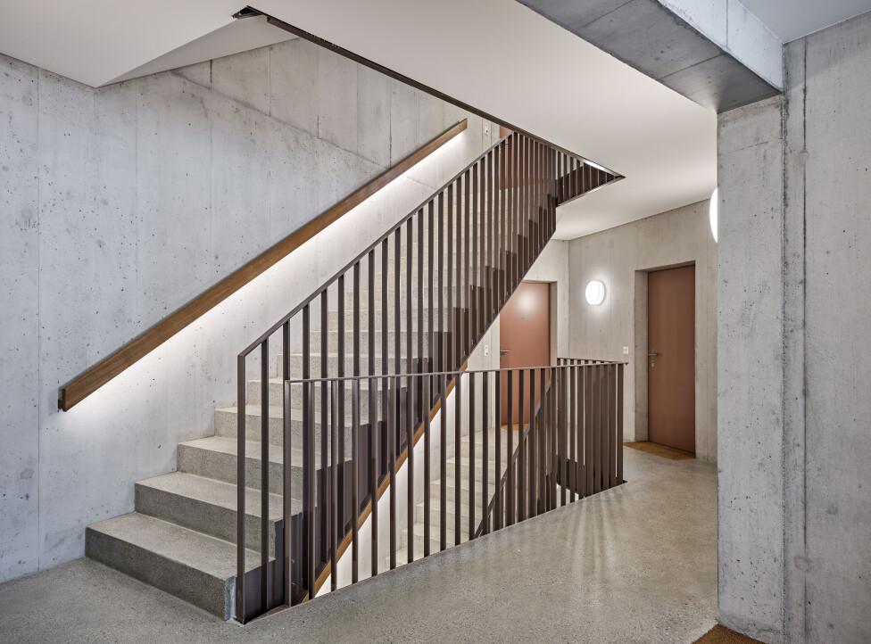 An zentralster Lage in Kleinandelfingen, auf einer sehr schwierig konfektionierten Bauparzelle, entstand ein selbstbewusst gestaltetes Mehrfamilienhaus mit einem eigenwilligen Fussabdruck. Zwei ortstypische Giebelvolumen werden ineinander geschoben und bilden nun einen Baukörper mit drei Stirnfassaden. Der normale Betrachter erfasst das Volumen jedoch nie in seinem Gesamten, sondern das Gebäude ordnet sich mit seinen gewohnten Proportionen in die Ortsstruktur ein. Die geöffneten Stirnfassaden bringen für Kernzonenbauten überdurchschnittlich viel Tageslicht in den dichten Baukörper.