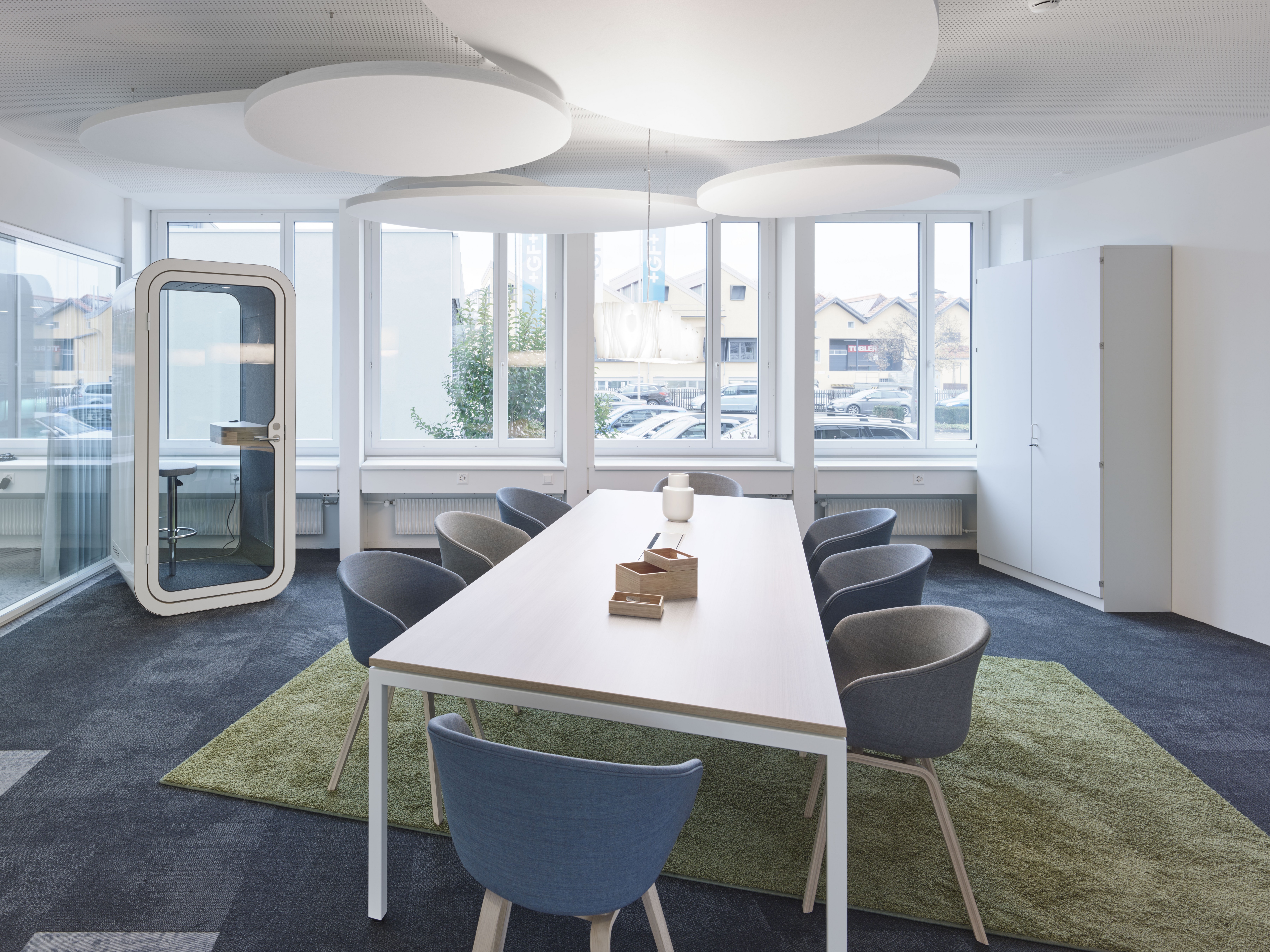 Die neuen Arbeitsbereiche bilden eine nachbarschaftliche Umgebung, welche Rückzug, Austausch und Innovation gleichermassen kombiniert. Dadurch entstehen familiäre Clusters, welche die Bewirtschaftung optimieren und die Nutzung der Büros systematisch und mobil gestalten. Eine abteilungsübergreifende Coworking-Zone für Austausch, Meeting und Begegnung fördert den firmenkulturellen Zusammenhalt von der Georg Fischer AG und optimiert die innovativen Prozesse und Synergien.